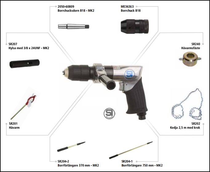 Systemet består i princip av en handborrmaskin, borrförlängare och kedja i olika kompositioner.