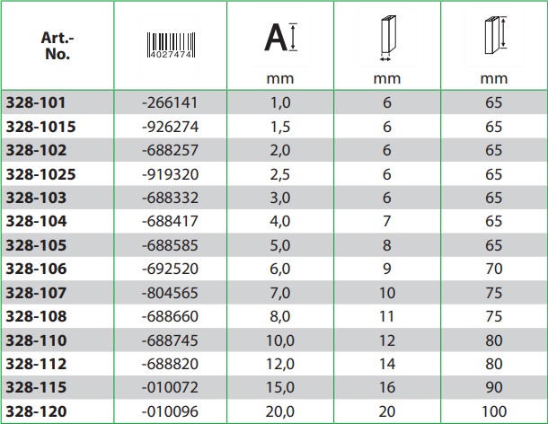Övriga storlekar från 1 - 20 mm tas hem på förfrågan.