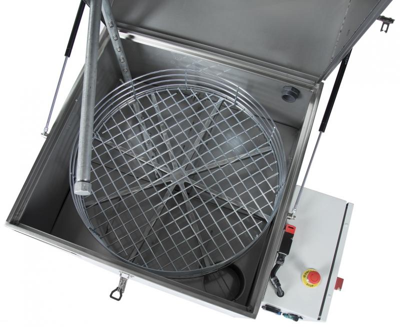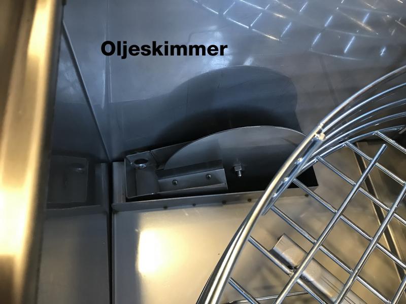 Automatisk smådelstvätt i rostfritt stål med värme, spolröret med dysor är fast, godskorgen roterar, oljeskimmer.