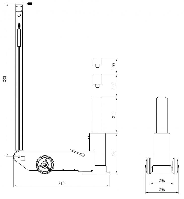 1-stegs lufthydraulisk domkraft för höga fordon, utrustad med ergonomiskt handtag, säkerhetsventil, dödsmansgrepp, förlängningar 100 & 200 mm ingår.