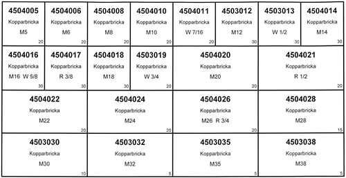 En sortimentlåda med 440st glödgade kopparbrickor som används som tätningsbrickor, 45HV.