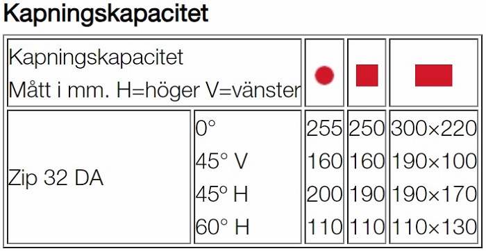 - Sågen gerar från 0° till 60° höger och 0° till 45° åt vänster.