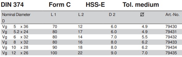 Maskingängtappar DIN374, Form C, HSS-E, för bilventiler "valve thread" DIN7756.