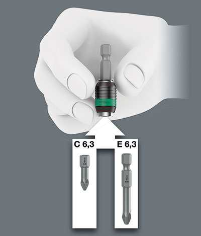 Bitshållare med magnet för bits enligt Form C 6,3 och E 6,3. Enhands manövrering av bitshållaren ger snabba byte av bits.