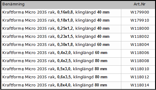 - Kraftform® Micro är en serie av instrumentskruvmejslar som lämpar sig väl för precisionsarbete inom finmekanik.